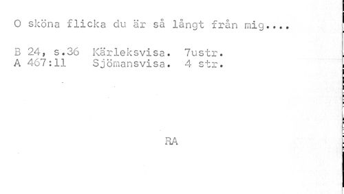 //// O sköna flicka du är så långt från mig... B 24, sv36 Kärleksvisa. 7ustr. //// A 467:11 Sjömansvisa. 4 str. ! //// ¦ //// i i //// RA //// I ////