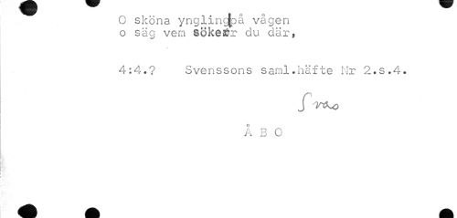 //// O sköna yngling|på vågen o säg vem SÖke&r du där, //// 4:4.? Svenssons sami.häfte Nr 2.S.4. //// frr^o //// A B O ////