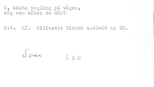 //// O, sköna yngling på vågen, säg vem söker du där? //// 5:4. LT. Silfvästs Visbok s.63-64 nr 35. //// I //// i //// Å B O ////