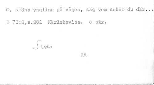 //// Å //// O, sköna yngling på vågen, säg vem söker du där... //// i //// i * //// B 73:2,s.201 Kärleksvisa. 6 str. //// <J Vrfis* //// RA 1 //// t //// ___ — ___. _ . ... . ... ... —S^ ////
