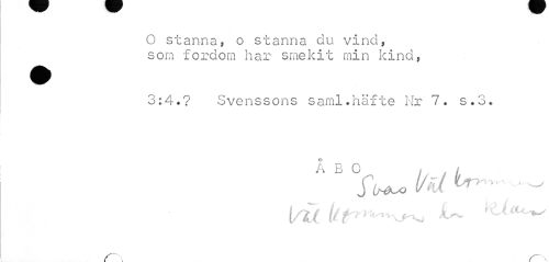 //// O stanna, o stanna du vind //// Som fordom har srnekat min kind. //// 3:4.? Svenssons saml.häfte Hr 7. s. 3. //// ÅBO ; : / //// I/U i- //// r...\ ////