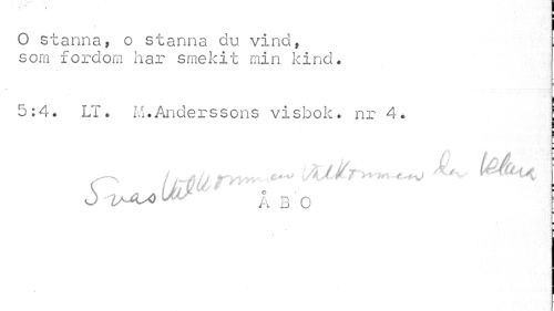 //// O stanna, o stanna du vind //// Som fordom har srnekat min kind. //// 5:4. LT. M.Anderssons visbok, nr 4. //// * //// ¦ ¦ //// - //// O y^oo lA' ' Å B O ; //// = //// 9 //// I ////