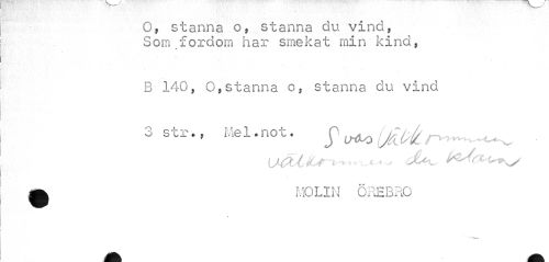 //// O, stanna o, stanna du vind, //// Som fordom har smekat min kind, //// »» //// B 140, O,stanna o, stanna du vind 3 str., Mel.not. Jl ^ //// UéVt "-ut- < ^ if&ff^^v-^y //// ^ MOLIN ÖREBRO ////
