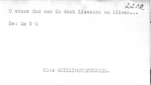 //// cleZ^ //// O store Gud var är dock Lissabon nu bliven... Se: Qa 5 b : //// KB:s SKILLINGTRYCKSREG * j ////