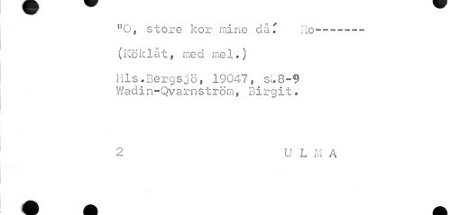 //// "O, store kor mine då T Ro--- //// (Köklåt, med mel.) //// Hls.Bergsjö, 19047, si.8-9 Wadin-Qvarnström, Birgit. //// 2 U L M A ////