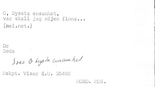 //// O, Syssta ensamhet, //// var skall jag nöjen finna... //// (mel.not.) //// Dr Boda //// Mskpt. Visor E.U. 35498 //// NORD. MUS. ////
