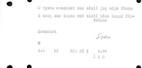 //// 0 tysta ensamhet var skall jag nöje finna //// 1 sorg som ingen vet skall mina dagar för- //// svinna //// Ensamhet 9 //// 9:3 LT INE 29 I s.94 //// o //// A B 0 ////