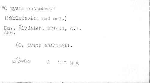 //// I //// n0 tysta ensamhet." //// (kärleksvisa med mel.) //// Da., Älvdalen, 2214:4, s.l. Ahs. //// (O, tysta ensamhet). cfirtsO å U L M A //// . ^ ' . ___^ _---jMitiÉåti^...,-å'JSKMM //// ___—___-___ —___ . —.. ////