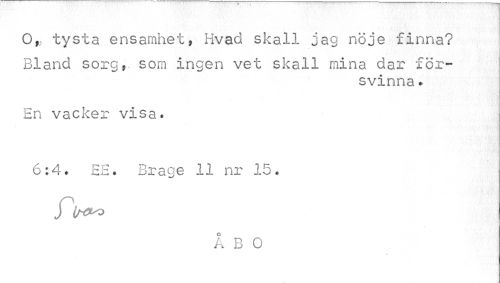 //// 09: tysta ensamhet, Hvad skall jag nöje finna? //// Bland sorg, som ingen vet skall mina dar försvinna * //// En vacker visa. //// 6:4. EE. Brage 11 nr 15. //// jWo //// o //// A B O ////
