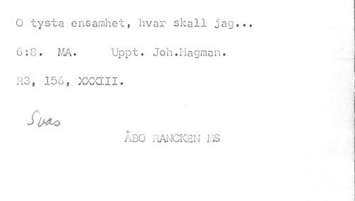 //// O tysta ensamhet, hvar skall jag.*. 6:8. MA. Uppt? Jon.Hagman. //// R3, 156, >000-11. | //// ÅBO RANCKEN I.S ////