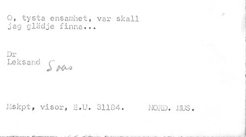 //// Oj tysta ensamhet, var skall jag glädje finna... //// Dr //// Leksand ^ ^ | //// | //// f //// I //// Mskptf visor, E.U. 31184. NORD. MUS. ////