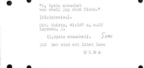 //// ^ "O, tysta ensamhet //// var skall jag nöje finna." //// (Kärleksvisa). //// Hrk. Knista, 41:147 a, s.82 Larsson, .. //// (O,tysta ensamhet). ) //// Jmf Det stod ett litet lamm //// U L M A ////