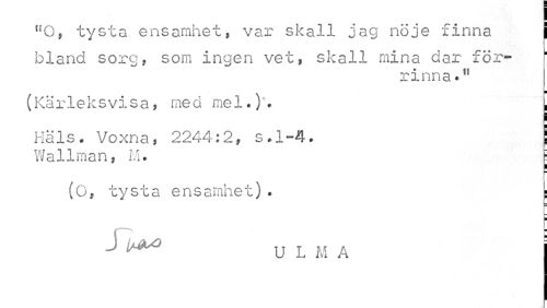 //// I //// nG, tysta ensamhet, var skall jag nöje finna I //// bland sorg, som ingen vet, skall mina dar förrinna.11 //// (Kärleksvisa, med mel.)* L //// Hals. Voxna, 2244:2, s.1-4. j //// Wallman, M. i //// P //// (O, tysta ensamhet). : //// J U L M A ////
