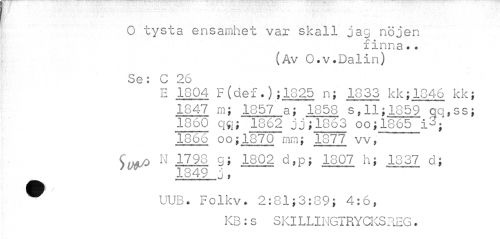 //// O tysta ensamhet var skall jag nöjen //// finna.. //// (Av O.v.Dalin) //// Se: C 26 //// E 1804 F(def.);1825 n; 1833 kk;1846 kk; //// 1847 rn; 1857 a; 1858 s, 11; 1859 qq,ss; 1860 qa; 1862 oj"; 1863 oo;1865 1866 oo;1870 mm; 1877 vv ~ //// C.., o N 1798 g; 1802 d, p; 1307 h; 1837 d; //// 1849 .i, //// ® UUB. Folkv. 2:81;3:89; 4:6, //// KB : s SKILLINGTRYCICS REG. ////