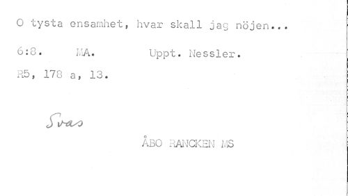 //// O tysta ensamhet, hvar skall jag nöjen... //// 6:0. MA. Upp t. Ne s s 1 ex-. //// R5, 178 a, 13. //// * //// JxhOyO //// ÅBO RANCKEN MS j ////
