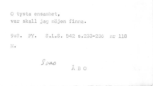 //// O tysta ensamhet, //// var skall jag nöjen finna. //// 9:8. PY. S.L.S. 542 s.233-236 nr 118 N. //// Sl^O //// o //// A B O ////