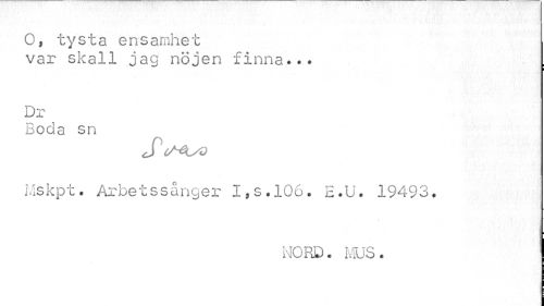 //// O, tysta ensamhet //// var skall jag nöjen finna*.. //// Dr //// Boda sn //// St/^tA) //// Mskpt. Arbetssånger I,s.l06. E.U. 19493. //// ; J //// NORD. MUS. ////