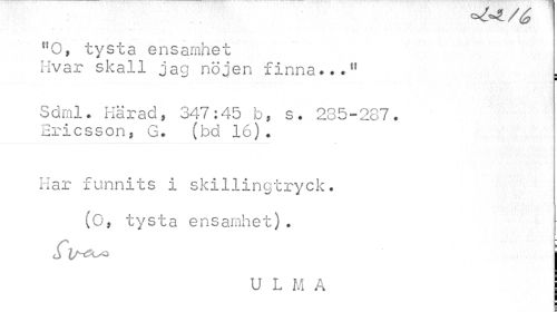 //// f,0, tysta ensamhet //// Hvar skall jag nöjen finna? ##lf , //// Sdml. Härad, 347:45 b, s. 285-287. Ericsson, G. (bd 16). //// Har funnits i skillingtryck. (O, tysta ens amhet). //// U L M A ////