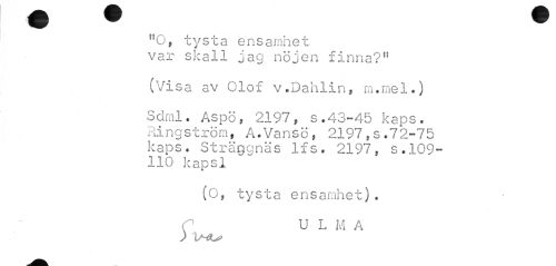 //// "O, tysta ensamhet //// var skall jag nöjen finna?" //// (Visa av Olof v.Dahlin, m.mel.) //// Sdml. Aspö, 2197, s.43-45 kaps. Ringström, A.Vansö, 2197,s.72-75 kaps. Sträggnäs lfs. 2197, s.109- //// 110 kapsl //// (O, tysta ensamhet). C U L M A //// ) Iaä^ ////