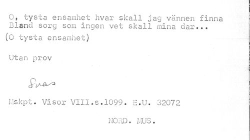 //// O, tysta ensamhet hvar skall jag vännen finna Bland sorg som ingen vet skall mina dar... //// (O tysta ensamhet) Utan prov //// ¦s //// Mskpt. Visor VIII.s.1099. i.U. 32072 //// NORD. i.US. ////