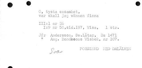 //// O, tysta ensamhet, //// var skall jag vännen finna //// jL «L : 1 nr 26 1:9 nr 53,sid.197, Visa, 1 str. //// Jfr Andersson. Sv.Låtar, Da 1471 !! Aug. Bondfeeons Visbok, nr 107. //// i //// o FORS LUND MED DALÄLVEN //// J ////