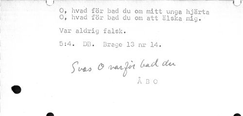 //// O, hvad för bad du om mitt unga hjärta O, hvad för bad du om att älska mig. - //// Var aldrig falsk. //// 5:4. DB. Brage 13 nr 14. //// o UcL //// ÅBO ////
