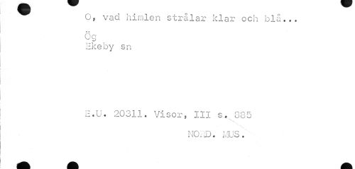 //// O, vad himlen strålar klar och blå... * * //// Og //// Ekeby sn //// E.U. 20311. Visor, III s. 385 //// f • //// • t //// NO.i). MUS. ////