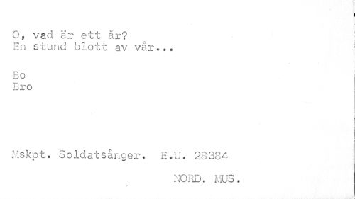 //// O, vad är ett år? En stund blott av vår... //// Bo Bro //// i //// Mskpt. Soldatsånger. E.U. 28334 //// NORD. MUS. //// / ////
