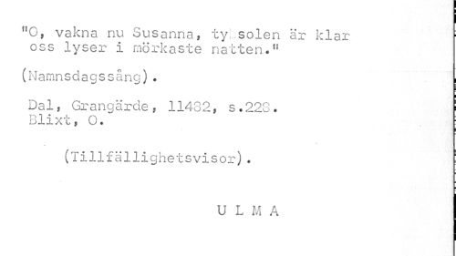 //// "O, vakna nu Susanna, ty:.solen är klar 1 //// oss lyser i mörkaste natten." //// (Namnsdagssång). ¦ //// i //// Dal, Grangärde, 11432, s.223. I //// Blixt, O. ; //// (Tillfällighetsvisor). ! //// i //// U L M A ////