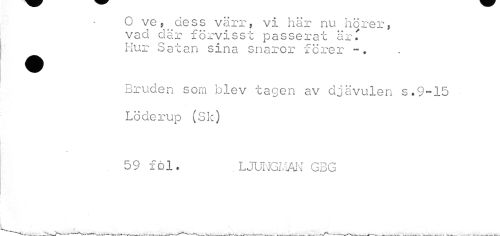 //// O ve,^dess värr, vi här nu hörer, vad dar förvisst passerat är.' Hur Satan sina snaror förer //// Bruden som blev tagen av djävulen s.9-15 Löderup (Sk) //// . 59 föl. . LJUmiJm G3G ////