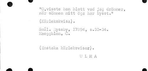 //// "O,visste hon blott vad jag drömmer, när sömnen mitt öga har kysst.11 //// (Kärlekskvisa). //// Smål. Ryssby, 17894, s.33-34. Haeggblorn, C. //// (Enstaka kärleksvisor). //// U L M A ////