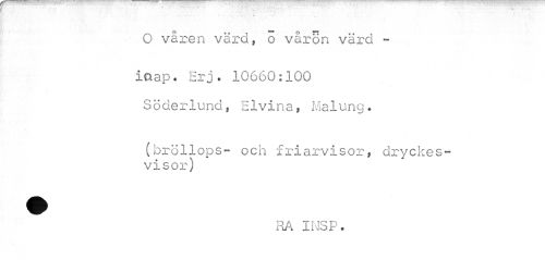 //// - - - - ... . . O våren värd, o vårön värd - //// iaap. Er j. 10660:100 Söderlund, Elvina, Malung. //// (bröllops- och friarvisor, dryckesvisor) //// RA INSP. ////