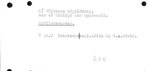 //// Of Välkomna högtidsdag, som så härligt har upprunnit* //// Bröllopsverser. //// 7 :3.? Svenssonslsaml.häfte Nr 9.s.49-50. //// Å B 0 ////