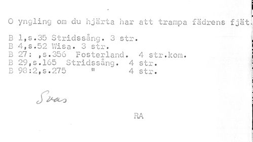 //// I //// O yngling om clu hjärta har att trampa fädrens fjät< //// B l,s.35 Stridssång. 3 str. t //// B 4,s.52 Wisa. 3 str. ! B 27: ,s.356 Fosterland. 4 str.kom. //// B 29,s.165 Stridssång. 4 str. ? //// B 93:2,s.275 " 4 str. f //// j //// ¦ //// RA //// « ////