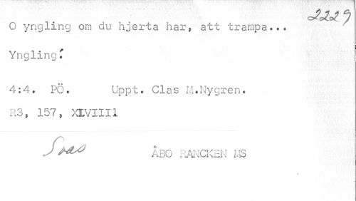 //// o //// O yngling om du hjerta har, att trampa... Yngling //// 4:4. PÖ. Uppt. Clas M.Nygren. //// R3, 157, XIVIII1 //// J M^ ÅBO PiANCKEN MS ////