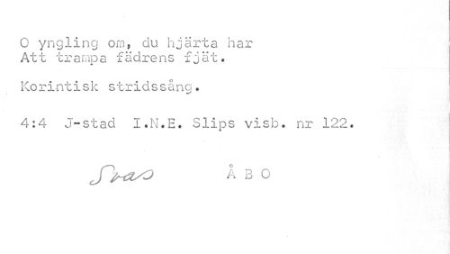 //// O yngling om» du hjärta har Att trampa fädrens fjät. //// Korintisk stridssång. //// 4:4 J-stad I • N. E • Slips visb. nr 122• //// - //// i //// J^^ayO åbo ////