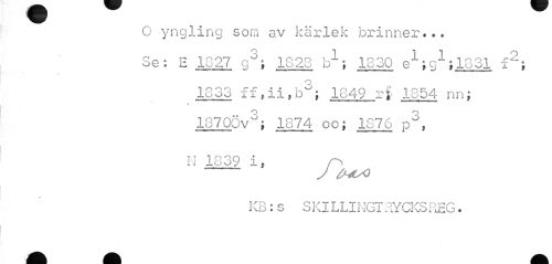 //// O yngling som av kärlek brinner... Se: E 1827 gJ; 1828 b1; 1830 e1;g1;1831 f2; //// 1833 ff,ii,b°; 1849 rf 1854 nn; //// \ //// 18700v^; 1874 oo; 1876 p3, //// N 1839 i, //// --J tHLsO //// KB:s SKILLIMGTRYCKSREG. ////