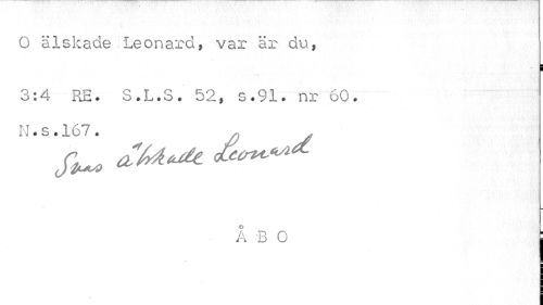 //// O älskade Leonard, var är du, //// s //// 3:4 RE- S.L.S. 52, s.91. nr 60. N.s.167. //// k B O j ////