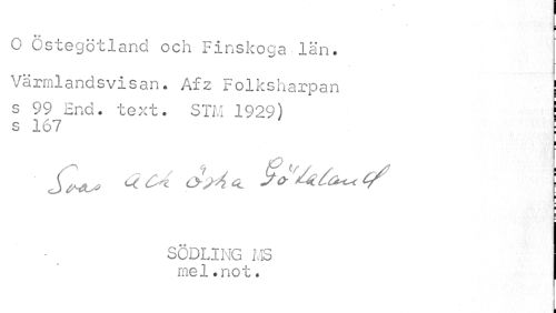 //// i //// * * //// G Cstegötland och Finskoga län. Värmlandsvisan. Afz Folksharpan //// s 99 End. text. STM 1929) ! //// s 167 ! //// I //// i //// ¦ //// SÖDLING MS mel.not. //// i ////