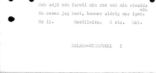 //// Och adjo och xarväl min ros och min utvalda //// vän //// Nu reser jag bort, kommer aldrig mer igen» Nr 11. Gesällvisa. 8 str. Mel. //// ZE LAND- ST HR1 WALL I ////