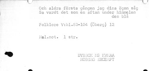 //// Och aldra första gången jag dina Ögon såg Sa vardt det som en aftan under himmelen //// den blå //// Folklore V:bl.83-104 (Öberg) 12 Mel*not* 1 str. //// fl^ DYBECK MS KVI-IAA //// MOBERG EXCERPT ////