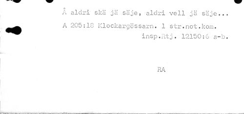 //// o //// A aldri skä jä säje? aldri vell jä säje... //// ^^^ A 205:18 Klockargössarn. 1 str .not .korn. //// insp.Rtj. 12150:6 a-b. //// v //// RA ////