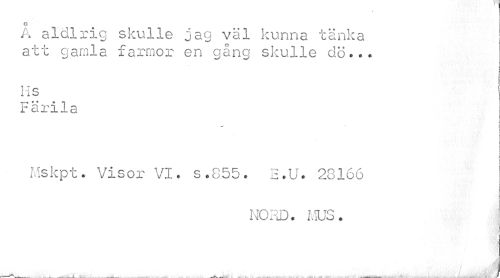 //// o //// A aldlrig skulle jag väl kunna tänka att gamla farmor en gång skulle dö... //// Hs //// Färila //// i //// \ //// i //// Mslcpt. Visor VI. s.855. E.U. 28166 //// NORD. MUS. //// ___. ... .. .___rK. ___^ ..._. • V ////