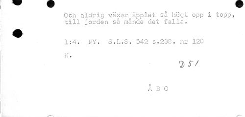 //// Och aldrig växer äpplet så högt opp i topp, till jorden så månde det falla. //// 1:4. PY. S.L.S. 542 s.238. nr 120 N. //// 9 r/ //// o //// A B O ////
