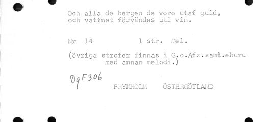 //// Och alla de bergen de voro utaf guld, och vattnet förvändes uti vin. //// Nr 14 1 str. Mel. //// (övriga strofer finnas i G.o.Afz.sami.ehuru //// med annan melodi.) //// fyFioL //// l FRYKHOLM ÖS TE RGÖT LAND ////