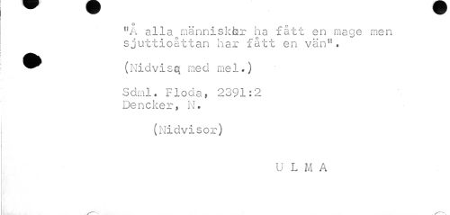 //// o 0 //// 11A alla människfar ha fatt en mage men sjuttioåttan har fått en vän". //// ^^ (Nid vis q me cl me 1 -) //// Sdml. Flöda? 2391:2 Dencker, N. //// (Nidvisor) //// U L M A ////