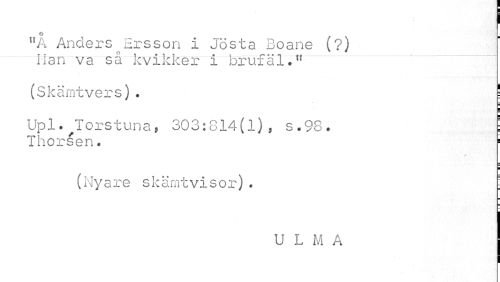 //// "A Anders Ersson i Jösta Boane (?) Han va så kvikker i bruf äl.t! //// (Skämtvers). ! //// ¦ //// = //// Upl.^Torstuna, 303:814(1), s.98. ! //// Thorsen. 1 //// ¦ //// (Nyare skämtvisor). i //// U L M A ////