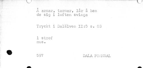 //// f •'.•'" • ¦ » //// A armar, tarmar, lår å ben //// de sig i luften svinga //// Tryckt i Dalälven 11:5 s. 83 //// 1 strof mus. //// ^ 597 dala forns al ////