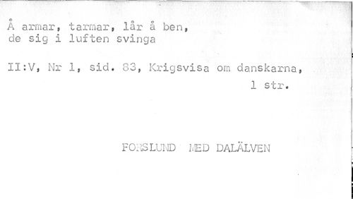 //// A armar, tarmar, lår å ben, de sig i luften svinga //// II:V, Nr 1, sid. 83, Krigsvisa om danskarna, //// 1 str* //// FORS LUND MED DALÄLVEN //// ¦ ////