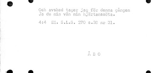 //// Och avsked tager jag för denna gången Ja du min vän min hjärtanssöta. //// 4:4 EE. S.L.S. 270 s.38 nr 21. //// Å B O ////